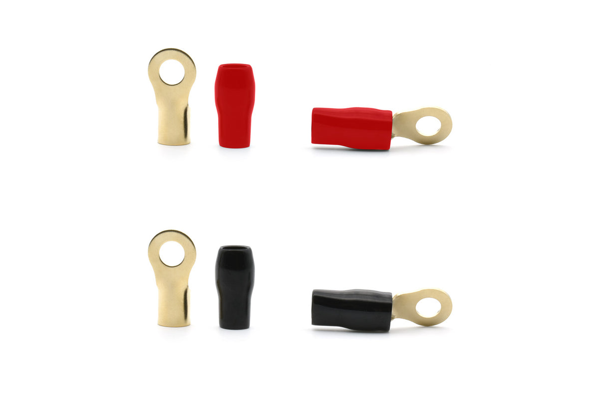 The Phonocar 4/214.3 are 4 gauge gold plated ring terminals with an 8mm ring opening. Sold as a pair with one black and one red boot.