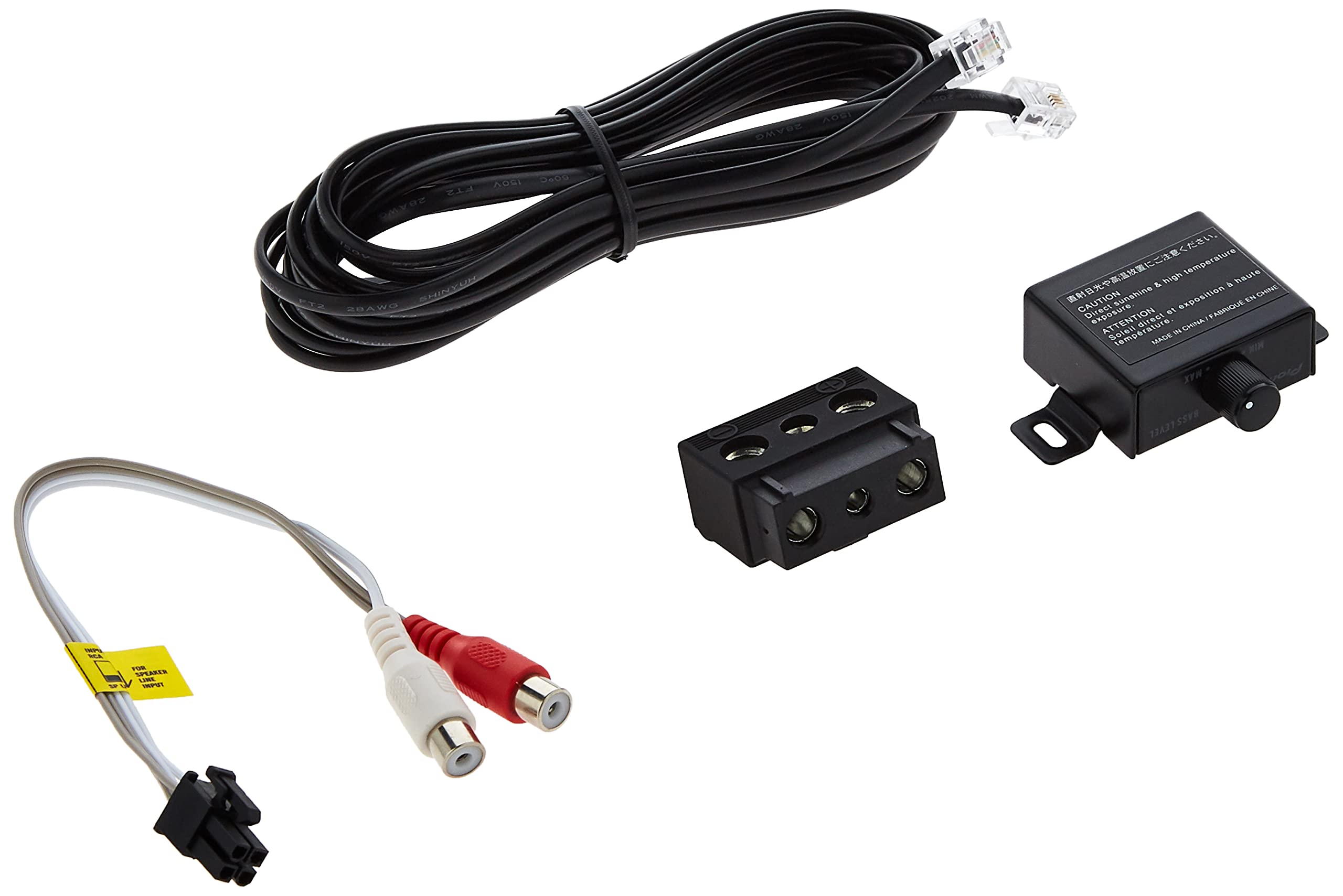 - Boxed Subwoofer, mounting bracket, RCA adapter, Bass controller