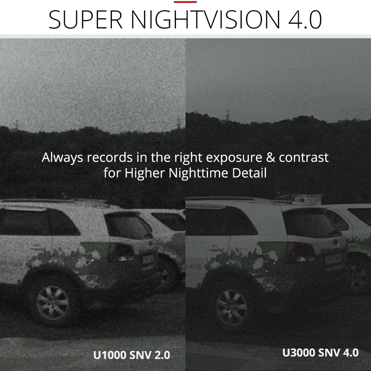 The U3000 PRO delivers improved 4K front and 2K rear recording compared to the U1000, thanks to STARVIS 2 and a more powerful Ambarella CPU. The addition of an adjustable bitrate offers the flexibility to record sharper footage. Also, the U3000 PRO features Super Night Vision 4.0 which takes advantage of STARVIS 2’s high sensitivity and low noise technology to help the dash cam capture clearer footage in low-light conditions.